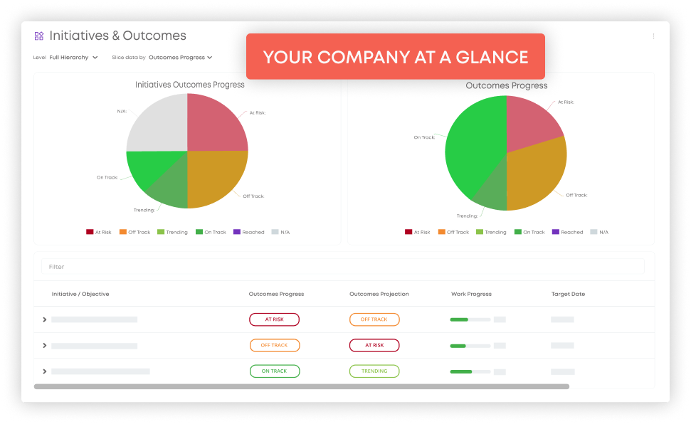 Use executive dashboards to monitor the status of your objectives. Detect risks early, assess outcome vs. work progress, aggregate data at the department level, and improve your decision-making.