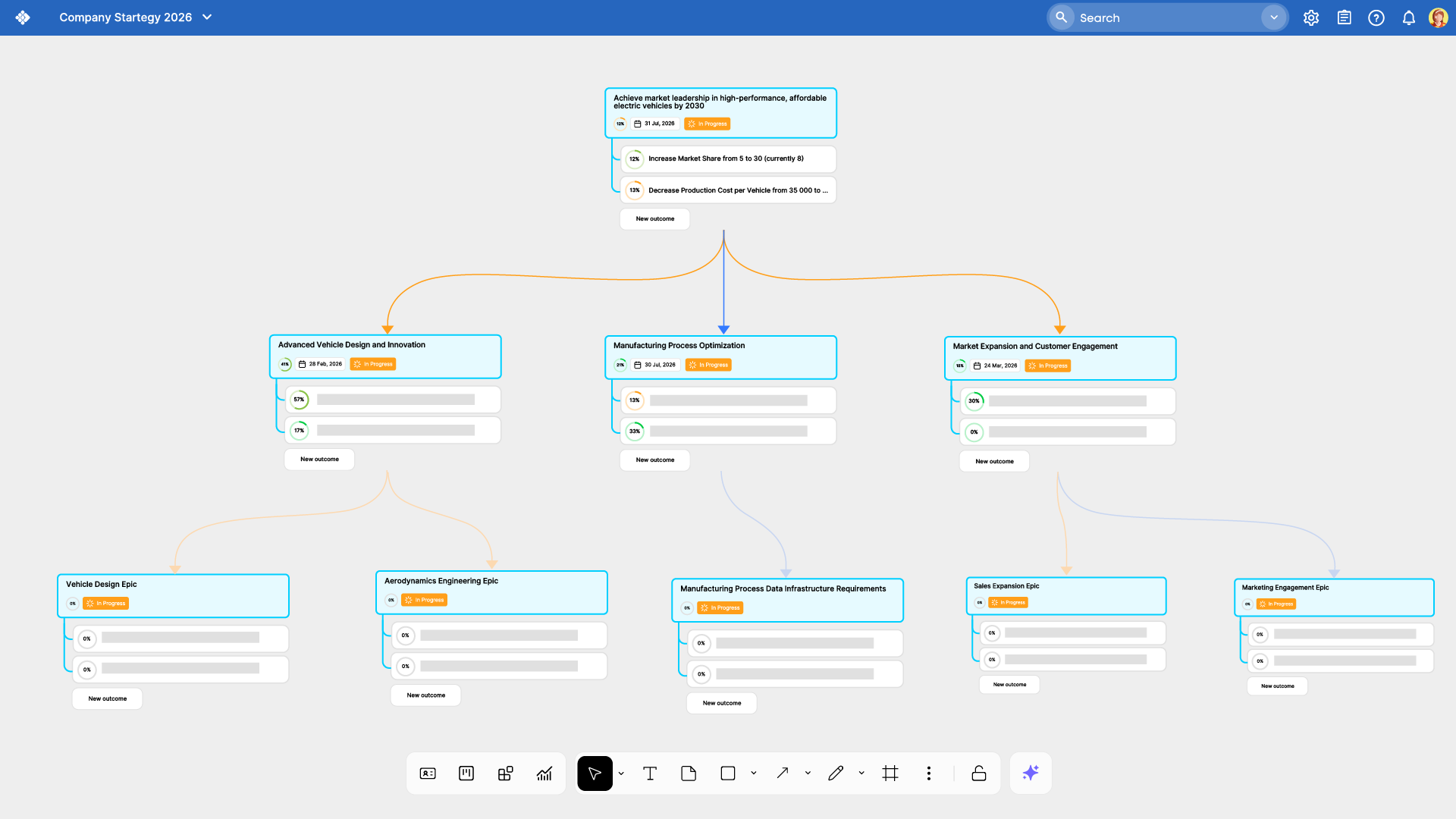 Conecta los OKRs con el trabajo real, no con presentaciones. Businessmap vincula la estrategia con la ejecución del trabajo a través de los equipos.