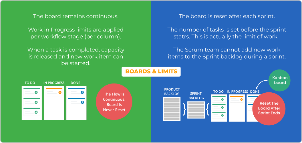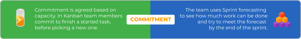 - Oprogramowanie Kanban pozwala ograniczać prace w toku, by zapewnić produktywność zespołu, dzięki zbilansowaniu pracy z możliwościami realizacyjnymi. Oprogramowanie Scrum nie daje zespołowi możliwości rozpoczęcia nowego zadania lub zmiany kolejki prac po rozpoczęciu sprintu. Pomaga tym samym w koncentracji na bieżącym zadaniu, lecz uniemożliwia adaptacje do mian wykraczających poza ustalony zakres sprintu.