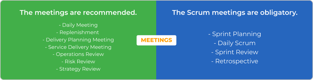 Jak wspomnieliśmy wcześniej, spotkania w Kanban są opcjonalne. Jeśli jednak będą one organizowane, to możliwe są ich dwa rodzaje: spotkania na poziomie zespołu i spotkania dotyczące dostarczanych usług i produktów pomagające utrzymać spójną pracę zespołu oraz stabilny przepływ.