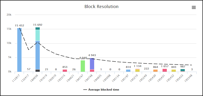 Para medir o tempo de bloqueio, no Businessmap, usamos o gráfico de Resolução de Bloqueio. Lá, podemos ver por quanto tempo determinados itens de trabalho permaneceram bloqueados, em quais estágios e o motivo dos bloqueadores. O monitoramento regular deste gráfico nos permite analisar as dependências, ver se algum cartão permanece bloqueado por muito tempo e otimizar progressivamente nossos processos.