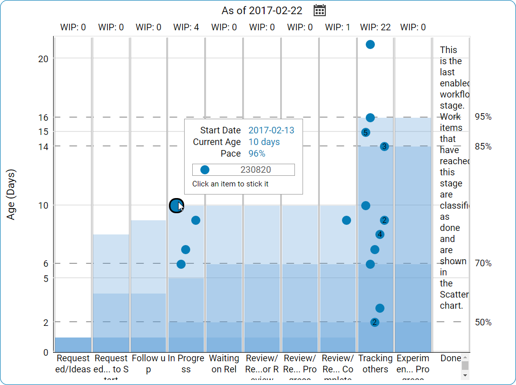 Medir o envelhecimento do trabalho em andamento é crucial em um ambiente de trabalho do conhecimento, porque você pode ver como suas tarefas estão progredindo no fluxo de trabalho. Isso mostra em quais estágios das tarefas do processo residem mais e por quanto tempo, em média, qualquer item de trabalho emergente deve envelhecer.